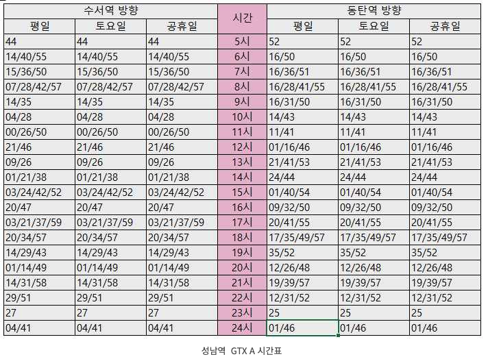 GTX A 노선은 수서, 성남, 그리고 동탄 등 3개 역에서 서비스를 시작했으며, 구성역은 6월 말에 개통할 예정입니다. 이 노선은 평일 기준으로 아침 5시 30분부터 운행을 시작하여, 막차는 각 역에서 새벽 1시에 도착하도록 운행됩니다. 이제 각 역에서 출발하는 GTX A 노선의 상세한 운행시간표를 살펴보겠습니다.