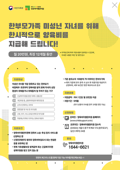 더불어, 기존의 한시적 양육비 긴급지원 제도를 확대하여, 중위소득 75%에서 100%로 범위를 넓히고, 자녀 1인당 월 20만 원을 선지급하는 방 안을 오는 9월부터 시행할 예정입니다. 이와 함께 양육비이행관리원을 통해 선지급 대상 심사부터 양육비 지급, 강제 징수에 이르기까지의 과정을 통합적으로 지원하며, 선지급 후에는 채무자의 동의 없이도 금융정보를 포함한 소득 및 재산 조사가 가능하도록 법률을 개정하여 정부가 우선 지원한 양육비의 신속한 회수를 목표로 하고 있습니다. 이 선지급제도는 현재 추진 중에 있으며, 이미 운영되고 있는 양육비 한시적 지급제도와 관련하여 지원 대상, 요건, 내용 및 신청 방법에 대해 자세히 알아볼 예정입니다.
